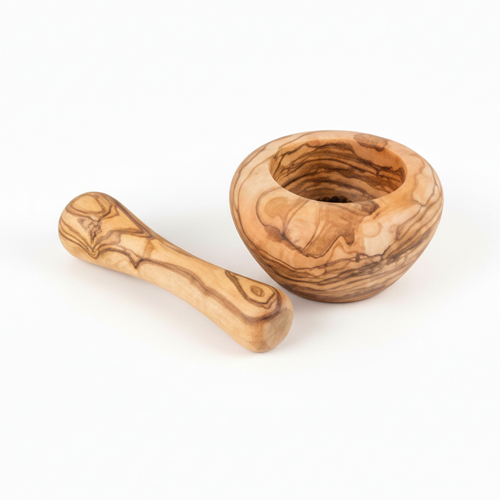 Un mortier rustique en bois d'olivier est un petit récipient creux, généralement accompagné de son pilon, utilisé pour broyer, écraser ou piler des herbes, épices, graines, noix ou ail. Il est taillé dans du bois d'olivier, un matériau noble et durable.