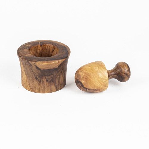 Un mortier rustique en bois d'olivier est un petit récipient creux, généralement accompagné de son pilon, utilisé pour broyer, écraser ou piler des herbes, épices, graines, noix ou ail. Il est taillé dans du bois d'olivier, un matériau noble et durable.
