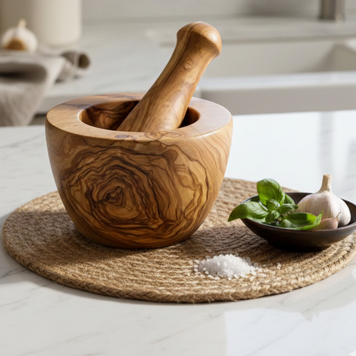 Un mortier rustique en bois d'olivier est un petit récipient creux, généralement accompagné de son pilon, utilisé pour broyer, écraser ou piler des herbes, épices, graines, noix ou ail. Il est taillé dans du bois d'olivier, un matériau noble et durable.